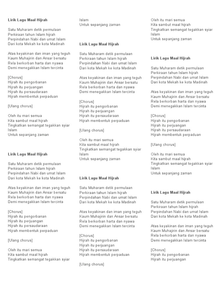 Lirik Lagu Tema Maal Hijrah. Tingkatkan semangat tegakkan syiar Islam. Lirik Lagu Tema Maal Hijrah Satu Muharram Detik Permulaan Perkiraan Tahun Islam Hijrah Perpindahan Nabi dan Umat Islam.